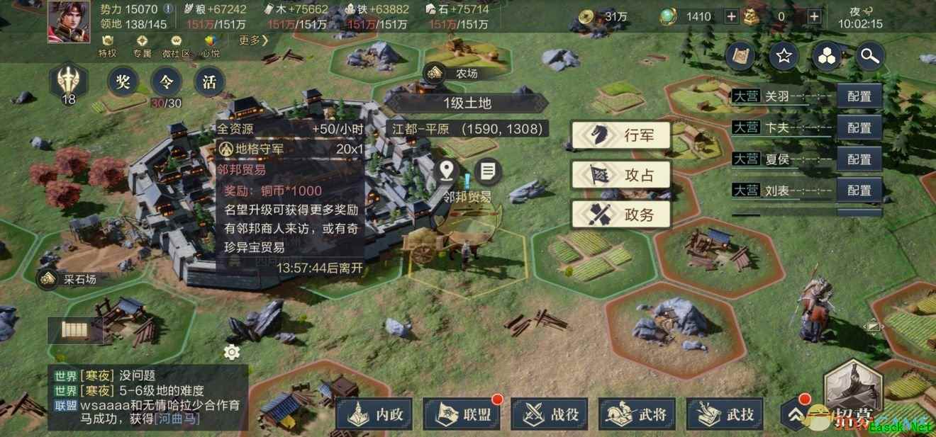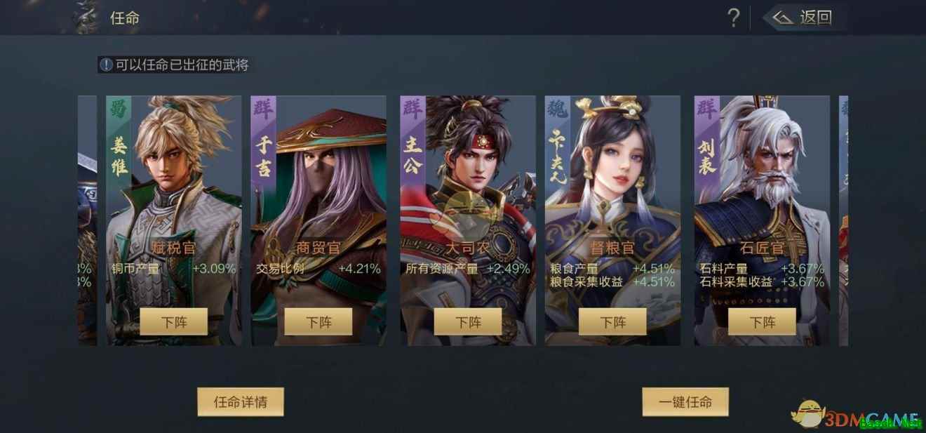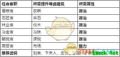 玩家通过任命武将来提高各种资源的产量。目前可任命的职位是大司农、督粮关、石匠官,赋税官以及商贸官。其中除了商贸官看的是武将的魅力值之外,剩下的都看的是政治点。另外,粮食,石料,铁矿以及林业这些官员的任命需要城内相应建筑达到10级。