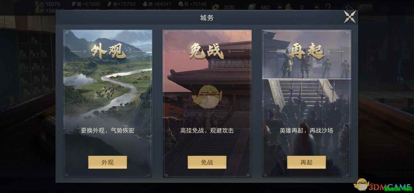 城务主要作用是用来免战、迁营以及更换外观的。免战准备时间为2.5小时,开启时长为6小时,但是开启后也会有6小时的冷却时间。如果利用好这个功能,卡准时间点,除了可以免战之外,还有可能绝地反击,给敌人带来重创。 以上就是小编整理的鸿图之下内政玩法攻略介绍,想知道更多相关资讯攻略的请关注易采游戏网。 本文内容来源于互联网,如有侵权请联系删除。 |