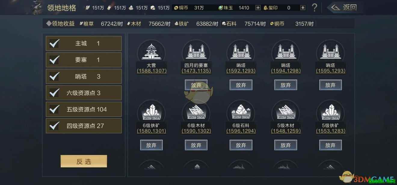 领地是用来统计目前为止你所占领的资源的数量,位置以及资源等级的,并且大家可以直接通过领地界面放弃低等级资源,跳转到某个指定哨塔,要塞等等。 前期因为大家占地多会选择自己家门口的资源,范围跨度小,所以领地的作用并不能完全体现出来,但是到了后期,势力高的人需要通过盟友的地盘,长时间行军找一块高级资源点,又或者是联盟攻城的时候,大家往往需要行军1个小时以上去很远的地方建立要塞。当自己的资源点非常分散,之后又想放弃的话,满地图去找很麻烦的,直接在领地放弃才是最方便的。 政务系统