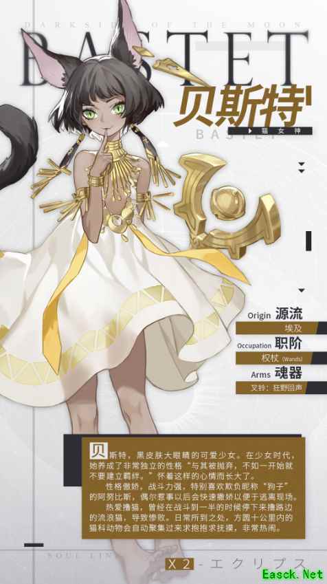 《解神者:X2》贝斯特资料介绍一、角色介绍 贝斯特,黑皮肤大眼睛的可爱少女。 在少女时代,她养成了非常独立的性格“与其被抛弃,不如一开始就不要建立羁绊。”怀着这样的心情而长大了。 性格傲娇,战斗力强,特别喜欢欺负昵称“狗子”的阿努比斯(也一视同仁欺负其他男生),偶尔惹事以后会快速撒娇以便于逃离现场。 热爱撸猫,曾经在战斗到一半的时候停下来撸路边的流浪猫,导致惨败。日常所到之处,方圆十公里内的猫科动物会自动聚集过来求抱抱求抚摸,非常热闹。“喵只想和强者一起改变世界。” 二、神格档案 源流:埃及 职阶:权杖(Wands) 魂器:叉铃:狂野回声