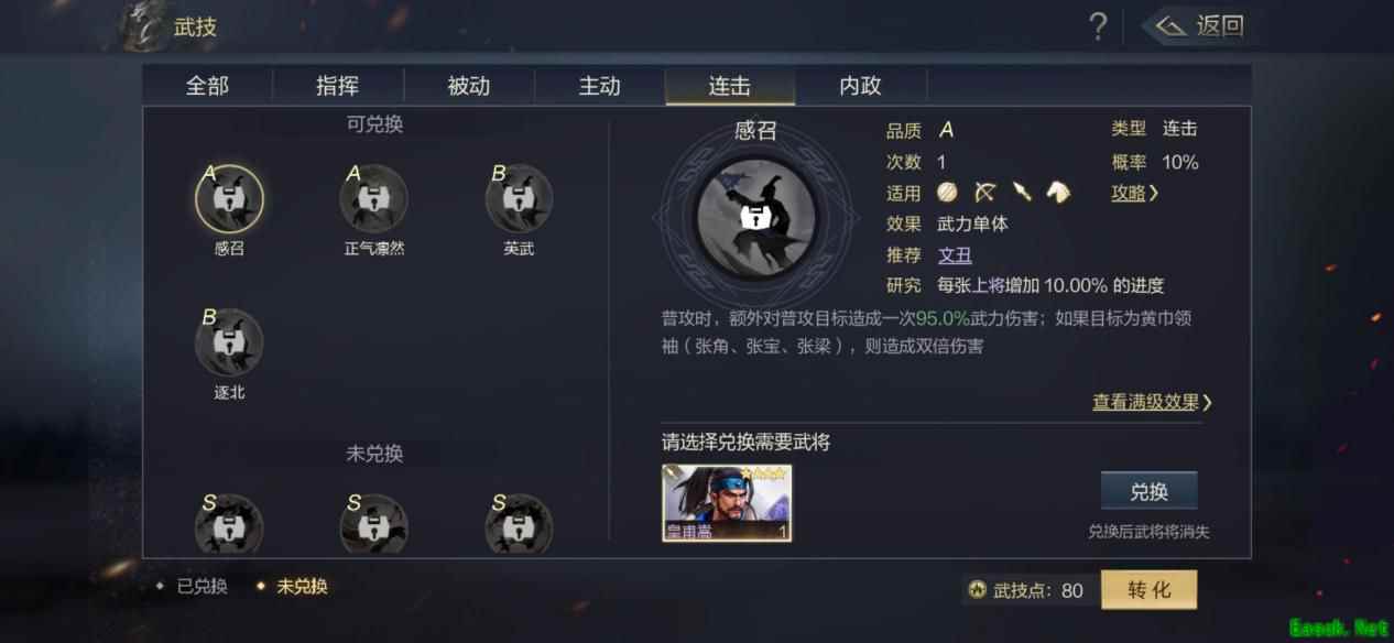 连击技,是武将在普攻时,能追加发动的一类技能。发动概率比主动技更低,大多在7%-12%之间。不过连击技没有冷却时间,运气好能够连续多次触发效果。