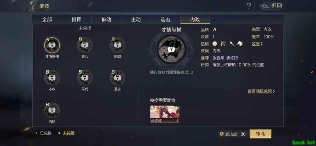 内政技,主要用于提高内政的收入,部分内政技能提高武将魅力,在战斗中不发动效果。