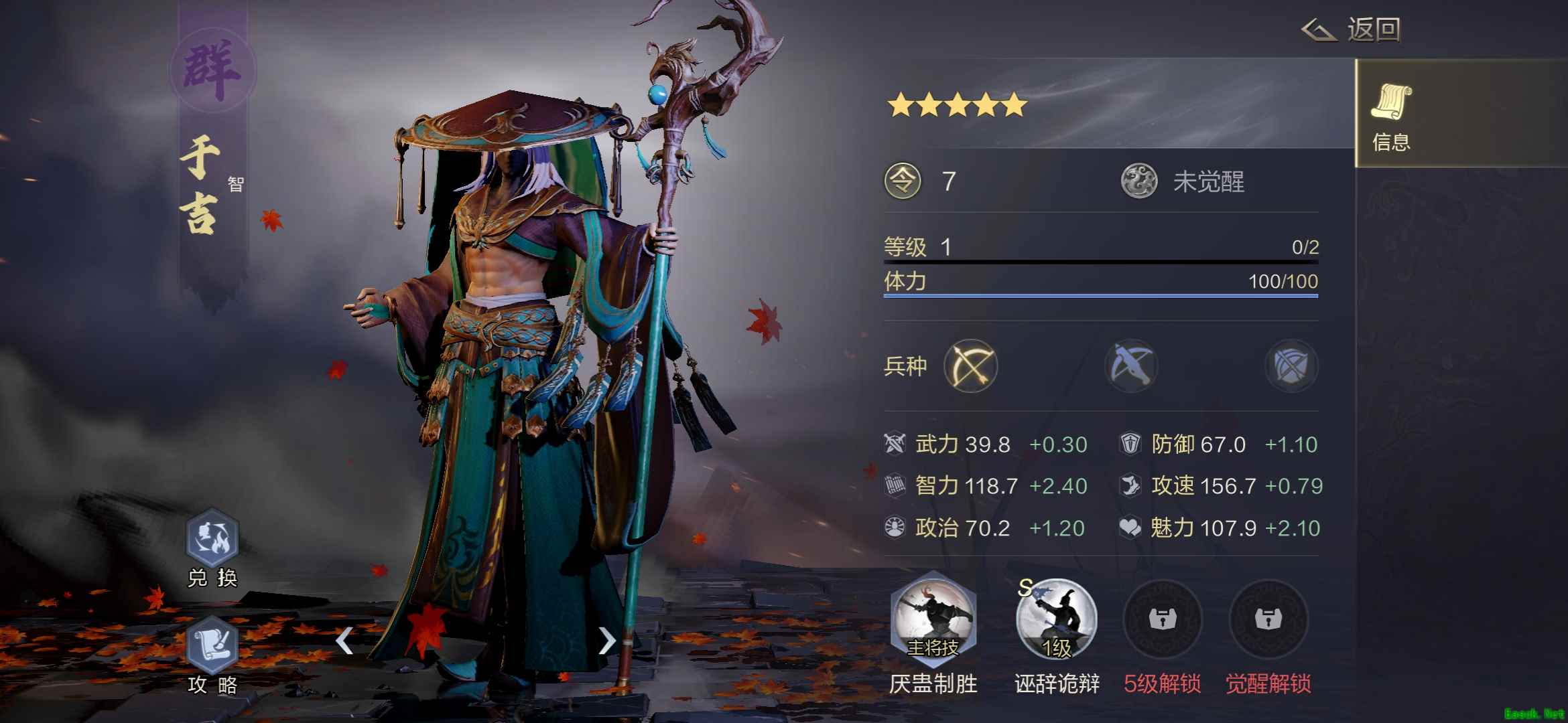【武将属性与羁绊大全】 《鸿图之下》于吉属性与羁绊大全强度分析 于吉是目前强度最低的名将了,而且没有羁绊等属性,是目前最适合当消耗品的,不过作为策略游戏,以后肯定会有于吉出头的时候。 面板属性
