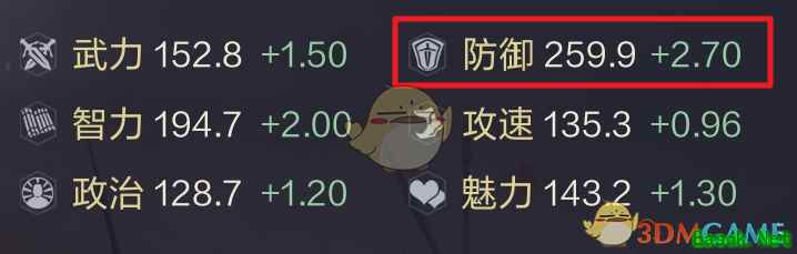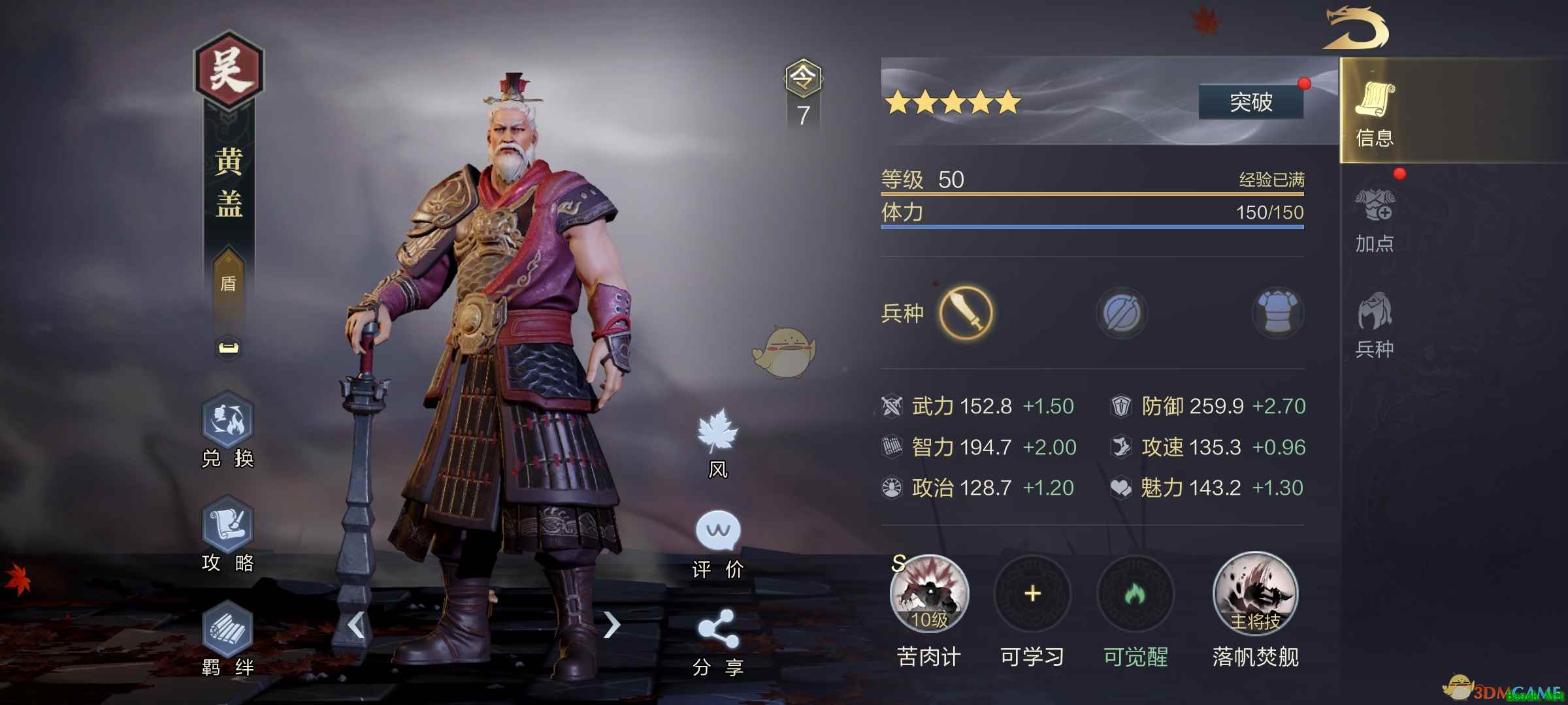 1、黄盖的定位是“盾”,属性中防御最高,满级259.8,智力其次,满级194.7,武力尚可,满级也有152.8,攻速属性就没有其他那么好看了,满级只有135.3。这样的属性,作为一个“盾”系武将,明显已经够看。尤其是259.9的极高防御,在“盾”系武将中,都可算是名列前茅。
