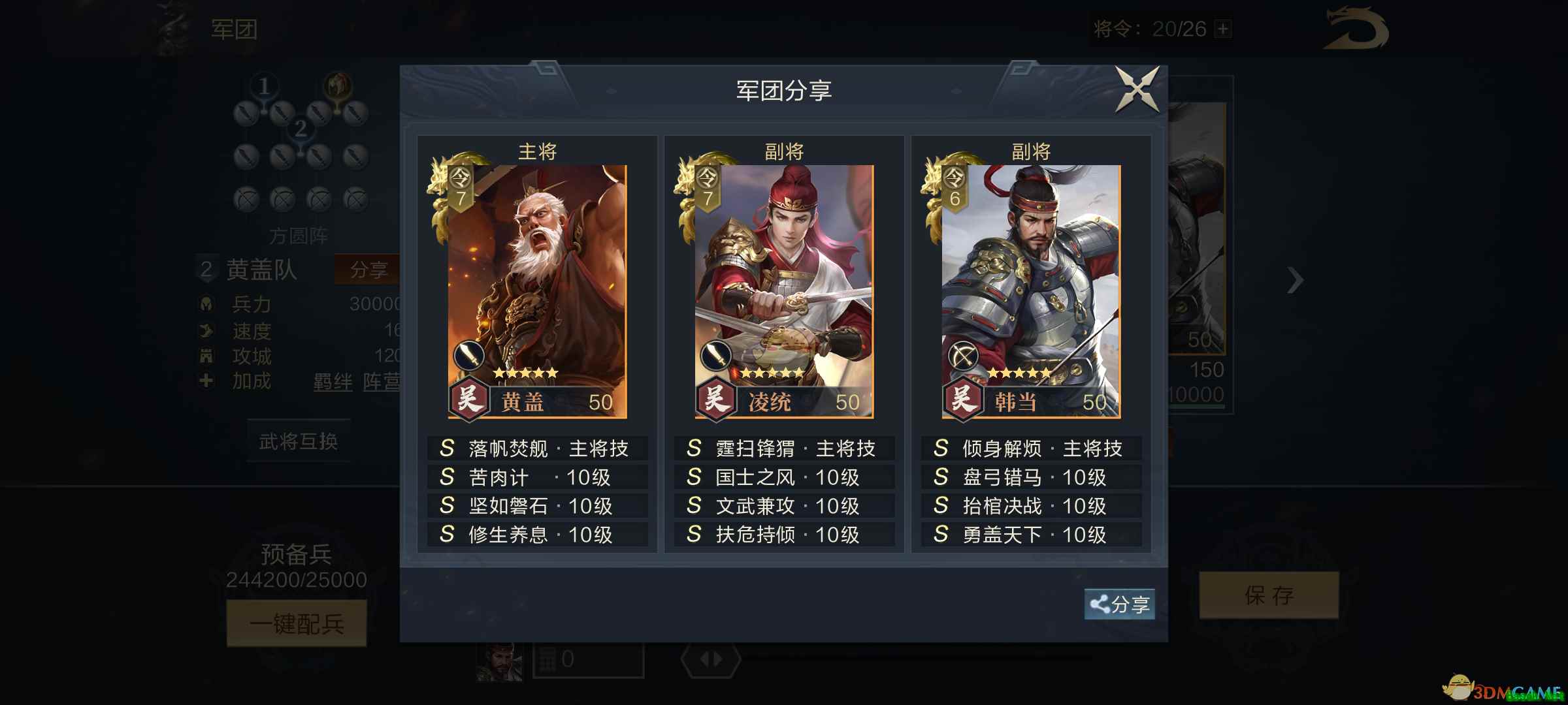武将搭配推荐 主将黄盖+凌统+韩当 1、因为羁绊“江表虎臣”的存在,黄盖有大量的队伍可以搭配,比如凌统和韩当。作为主将的黄盖,可以通过“落帆焚舰”“坚如磐石”和“休养生息”,增加自身坦度,继而通过“苦肉计”吸引敌方火力。 2、与此同时,副将凌统可以通过“国士之风”和“文武兼攻”输出武力、智力兼备的伤害,而副将韩当则可以通过自身技能“盘弓错马”克制敌方骑兵、弓兵类武将。同时,韩当在安全的前提下,携带上“抬棺死战”和“勇盖天下”输出大量伤害。