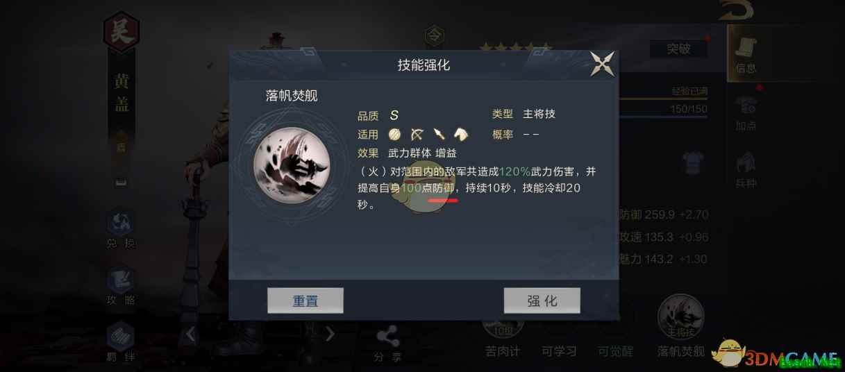 2、黄盖的主将技是S级武技“落帆焚舰”,典故直接来源于三国历史上的赤壁之战。“落帆焚舰”可以对范围内的敌军共造成120%武力伤害,并提高自身100点防御属性,持续10秒。“落帆焚舰”是一个伤害数值十分普通的技能,但提高自身100点防御,对于防御已经十分可观的黄盖来说,确实能起到更上层楼的作用。