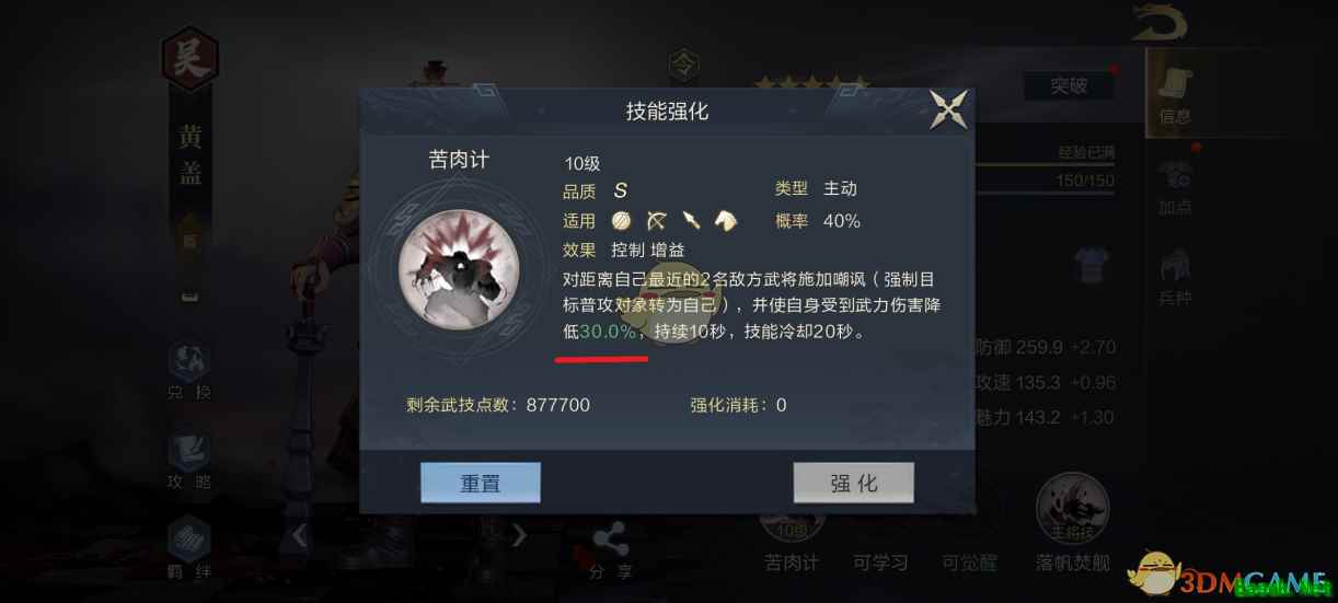 3、黄盖的特色武技和可以兑换的技能,都是S级主动技“苦肉计”,发动时可以对距离自身最近的2名敌方武将施加嘲讽,强行使他们攻击黄盖。同时,也会使自身受到物理伤害降低30%,持续十秒。 4、“苦肉计”是一个“盾”系武将的神级武技,强行施加的嘲讽效果,再加上满级后足有30%的减伤,可以使几乎任何“盾”系武将在战场上的表现变得更强。