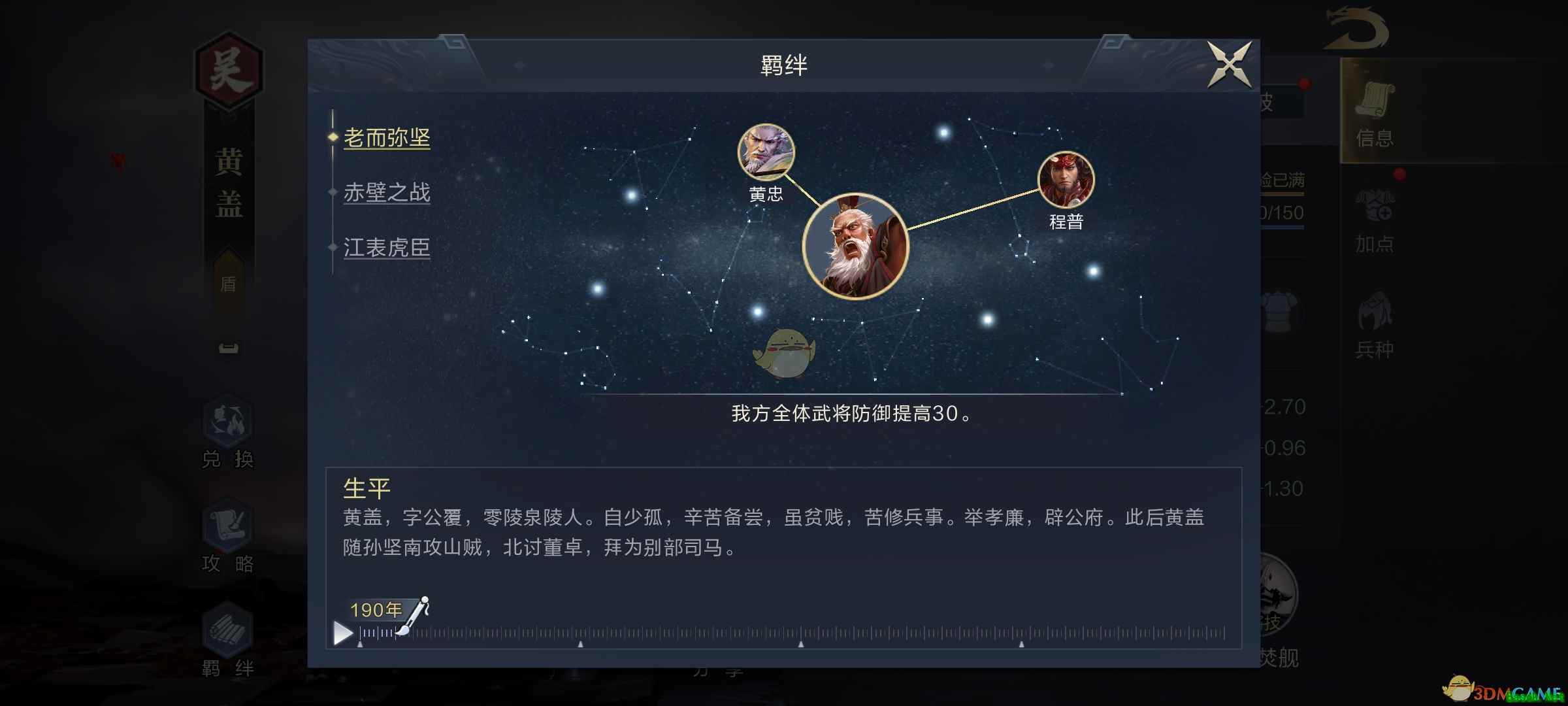 5、黄盖的兵种是步兵,对抗枪兵时可以提升10%的伤害,且减免受到枪兵伤害的10%。进阶兵种是“盾甲兵”和“藤甲兵”。 6、“盾甲兵”可以“持盾”,受到弓兵伤害减少25%,但也有“破绽”,减少自身对枪兵的克制5%。“藤甲兵”身穿“藤甲”,可以减少受到武力伤害的25%,但也很“易燃”,受到火伤害会增加40%。 7、羁绊方面,黄盖拥有多种选择。他可以和黄忠、程普组成“老而弥坚”,提高我方全体武将30点防御。可以和甘宁、周瑜组成羁绊“赤壁之战”,使我方全体武将提高5%主动武技伤害。也可以和蒋钦、甘宁、丁奉、凌统、韩当、程普组成“江表虎臣”,提高我方全体武将10点武力,以及5%的暴击几率。