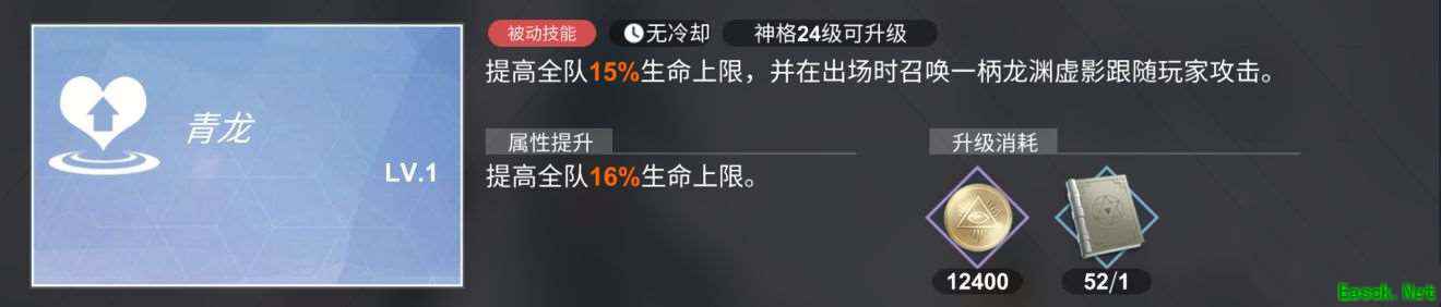 源流:华夏 职阶:剑柄 魂器:神剑龙渊 从神代以来,就与其他三位四神一起,守护着东方大陆。 这片大陆十分古老、强大,且经历了无数次的变乱。在屡次变乱中,四神为了守护它,就把自己作为神的身躯降入大地,和大地融为一体。正因为四神用自己的神体和大地结合,因此在“蚀”降临的时候,世界各区域中,只有东方大陆巍然不动, 屹立不倒。 二、技能介绍 1、被动: