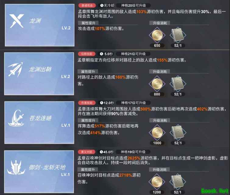 提高全队百分比的生命上限,并在出场时召唤柄龙渊虚影跟着朋友攻击。 2、普通攻击: 孟章挥舞龙渊对周围的敌人造成百分比的源初输出,而且每段输出提升30%,最终一段会击飞所有敌人。 3、神权: