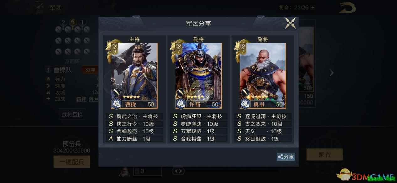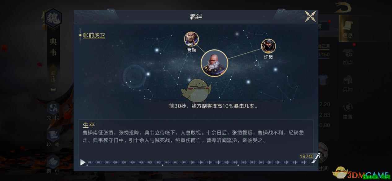 6、武将羁绊方面,典韦可以和曹操、许诸组成“帐前虎卫”羁绊,效果为战斗前30秒,为我方副将提供10%的额外暴击几率。因此在搭配武将时,可以重点考虑利用该羁绊特性,让典韦作为副将登场,羁绊效果配合其技能的高爆发伤害,可以在战斗前期为我方创造显著优势。
