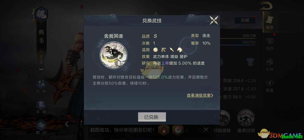 5、典韦分解后的兑换武技为“舍我其谁”,同样也是一项非常强力的爆发伤害技能,也额外带有一定的辅助减伤效果。技能发动时,可以额外对普攻目标造成一次125%的伤害,并替我方主将分担50%的伤害,持续10秒,有着非常实用的保将功能。