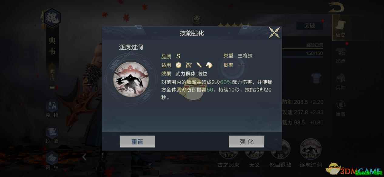 3、典韦的主将技能为“逐虎过涧”,是一项群体增益技能。效果为,在对范围内敌人造成连续多段伤害时,使我方全体武将防御提高50,持续10秒。该主将技能虽说能打能抗,但综合表现并不出众,因此并不建议将典韦作为主将使用。