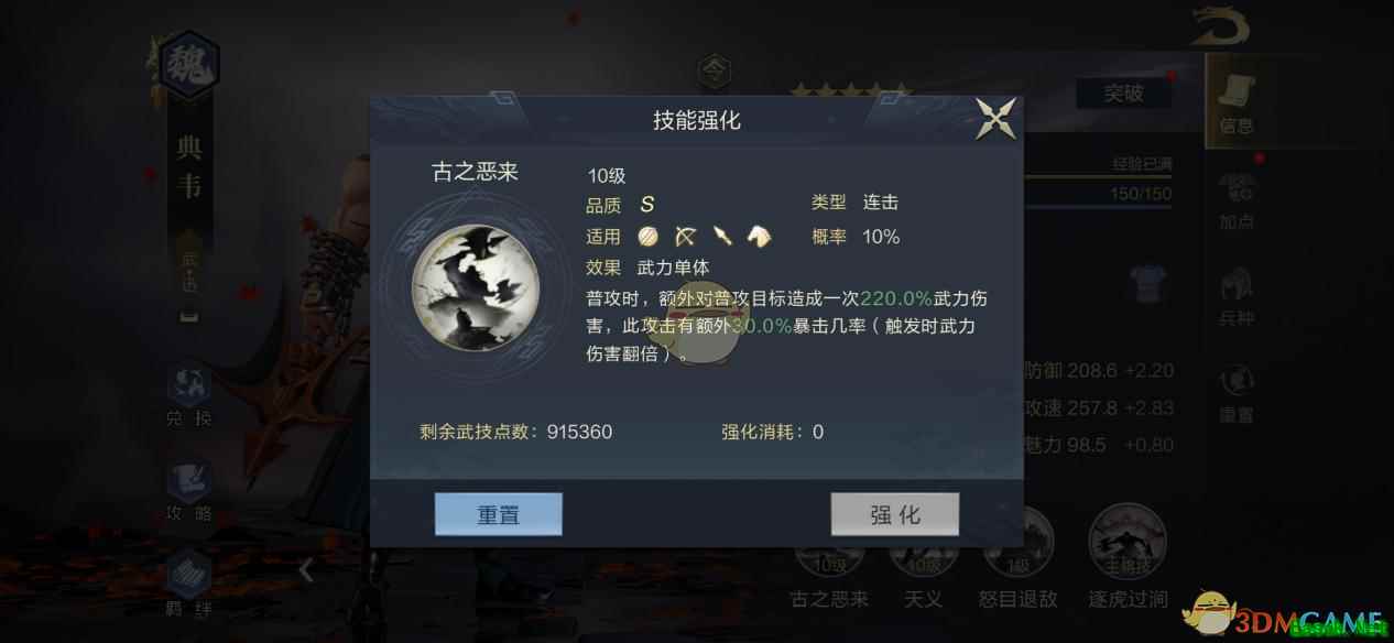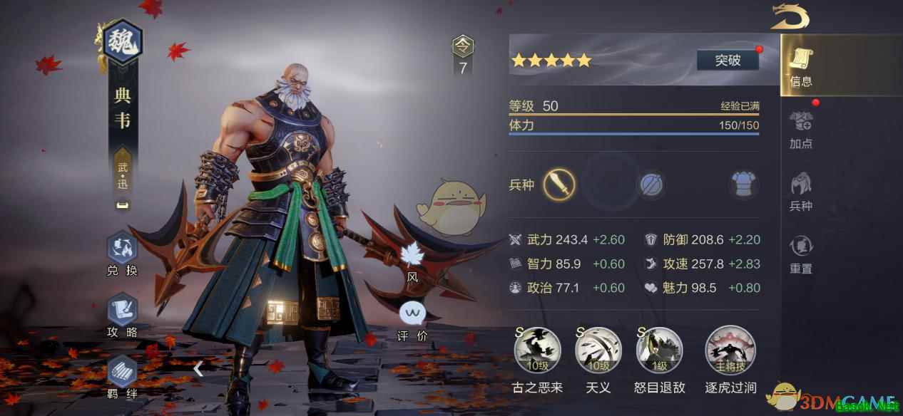 4、典韦的专属技能为“古之恶来”,效果为普攻时额外对对手造成一次220%的物理伤害,此外该攻击有30%的几率触发暴击,造成翻倍伤害。这一技能,能使典韦的伤害得到爆发性增强,是非常强力的攻击型技能,唯一遗憾在于该技能的触发几率较低。