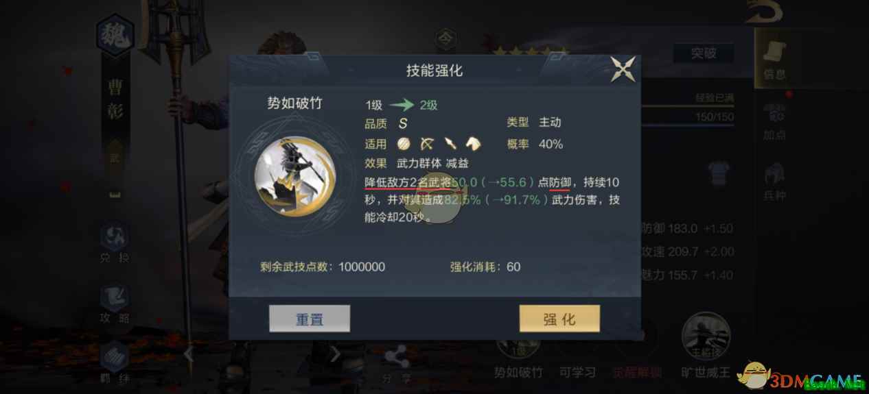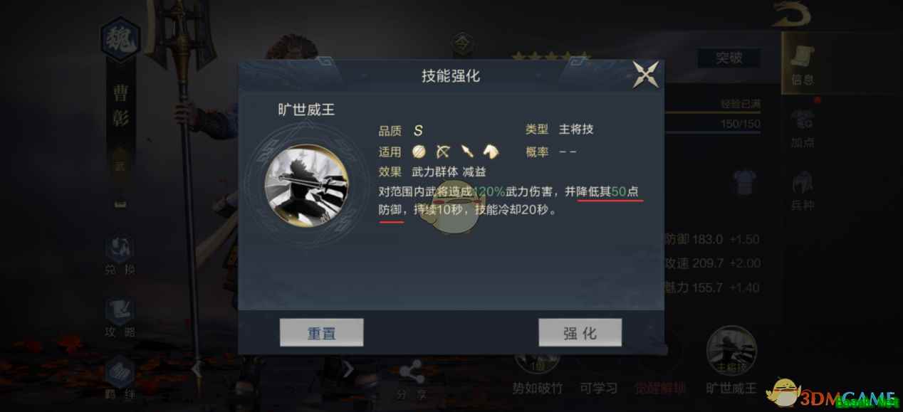 5、曹彰自带的专属技能为“势如破竹”,主动技。“势如破竹”能指定两名敌方武将,造成武力伤害的同时,削减敌方的防御,并且数值随着技能等级提升而增加。这使得曹彰成为一个无情的“减防机器”。配合主将技“旷世威王”,即便是盾系武将,在曹彰面前也会变成低防御的脆皮。