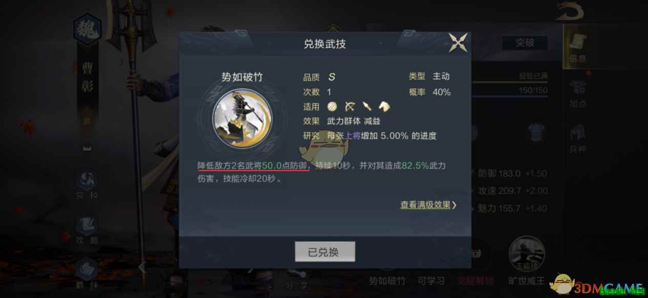 6、分解曹彰后,同样会获得主动技“势如破竹”。这就意味着能以曹彰为核心,搭配一支“减甲流”队伍,对于那些以高防御为特色的队伍,有一定的克制效果。