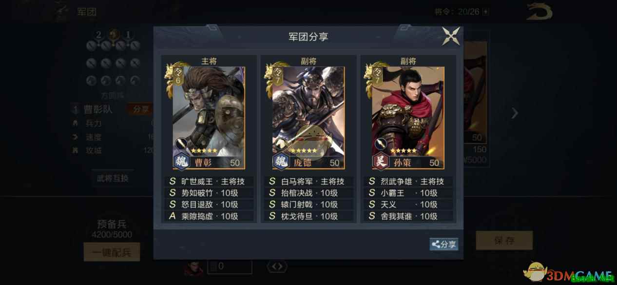 武将搭配推荐: 主将曹彰+庞德+孙策 1、在战斗时,曹彰放主将或副将位皆可。若是想围绕曹彰组建“破甲队”,建议曹彰做主将,其主将技“旷世威王”能更大程度地发挥曹彰的减防能力。在携带技能上,由于曹彰有着不错的攻速,可以考虑携带连击技。例如S级连击技“怒目退敌”,就能进一步降低敌方武将的防御力。或者携带A级主动技“乘隙捣虚”,对敌方防御最低的武将完成点杀。 2、阵容搭配上选择庞德和孙策。庞德的“抬棺决战”能大幅提升自己造成的武力伤害,而孙策的被动技“小霸王”,则自带破甲效果。能够快速解决低防御的武将。