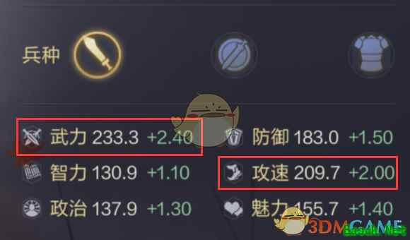 2、曹彰在游戏中的定位为“武”。其满级233.3的武力,牢牢占据着一流武力武将的行列。但是曹彰满级防御仅183.0,低于一流武力武将防御的平均水平。好在其209.7的满级攻速,能略微弥补防御上的不足。