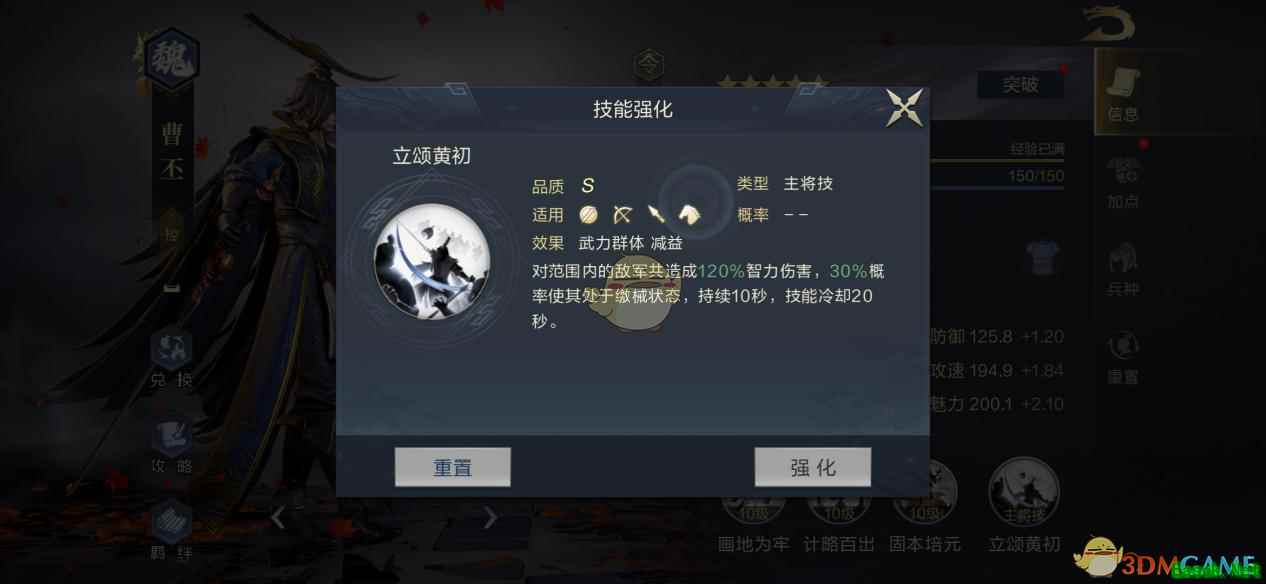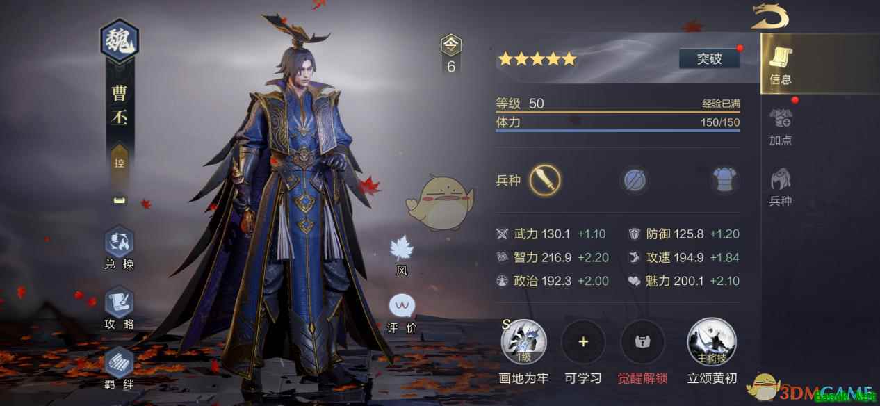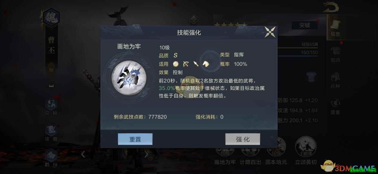 5、专属武将技能为“画地为牢”,同样是强力的控制型技能。释放后,会随机选取两名地方政治属性最低的敌人,有35的概率使其处于缴械状态,而且,如果目标政治属性低于曹丕自身,缴械的触发概率还会翻倍。而前面我们介绍过,曹丕是少有的政治属性近200的武将,所以该技能的实际触发几率还是非常高的。