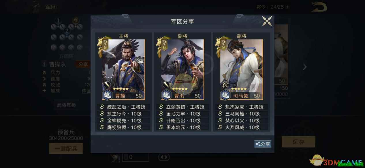 6、分解曹丕后得到的兑换技能同样也是“画地为牢”,可以用来装配其他高政治属性但容易被连击队针对的武将,大幅提升武将的存活几率。 武将推荐搭配 主将曹丕+曹丕+司马懿 1、该阵容武将都有着强力的控制技能,能有效应对敌方队伍中带有连击技能的武将。同时主将曹操的主将技,能提高我方队伍武将的智力属性,为队伍提供更好的输出环境。 2、技能搭配上,由于主打控制和智力伤害,所以可以给曹丕搭配“固本培元”加“计略百出”,“固本培元”可以起到为我方回复兵力的效果,同时获得一定的物理减伤,提高整个队伍的续航能力。“计略白出”配合曹丕较高的智力伤害,也是不错的输出手段。