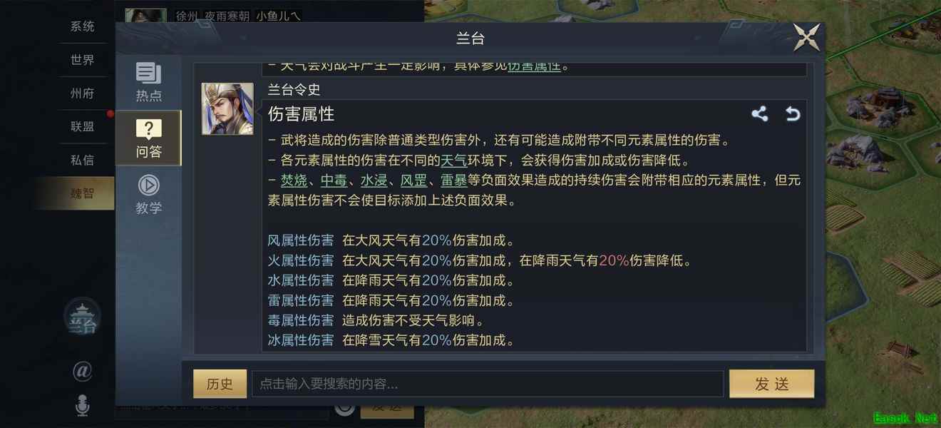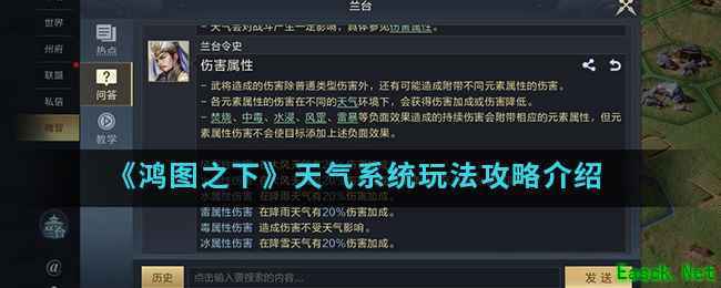 1、水淹七军是一个主动类型武技,在释放后能立即造成部分伤害并施加水浸效果,同时,水淹七军能和雨天战场产生联动,造成额外的力竭效果。 2、这段描述中涉及了好几个点,①武技类型,②负面效果,③天气系统。前两点在之后的【萌新帮扶计划】中我都会展开讲,第一期我们先着眼于第三点,天气系统。 面板描述中的雨天战场直属于天气系统,是鸿图原创的作战系统之一。在游戏地图界面的右上角,时间栏的上方,各位主公可以看到自己所处州的天气情况。点击图标展开,还可以看到未来两小时内的天气预报。