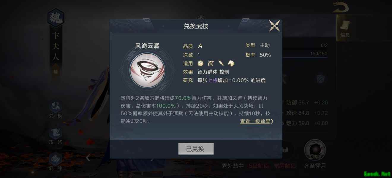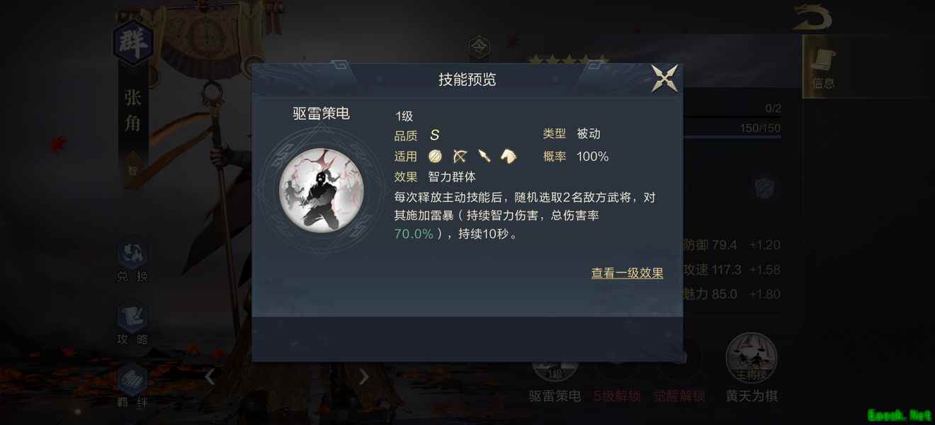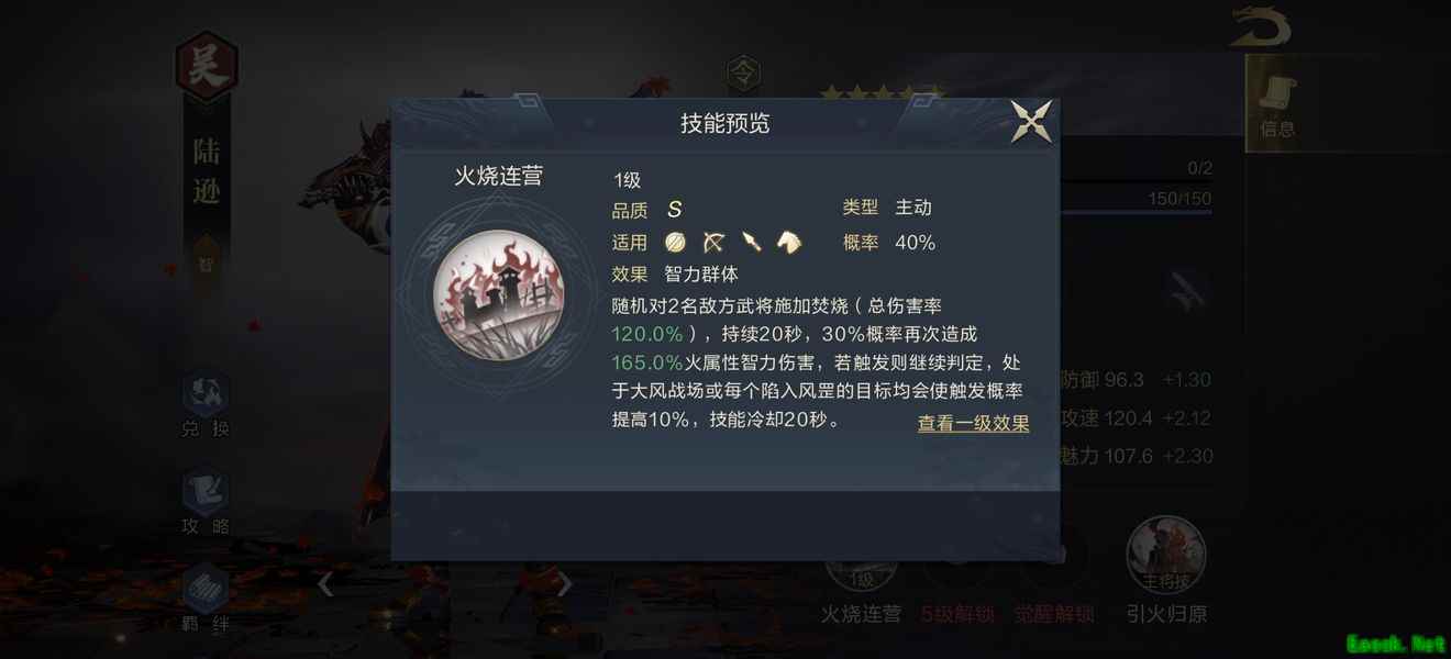 具体例子如:陆逊的自带武技火烧连营和张角的自带武技驱雷策电。
