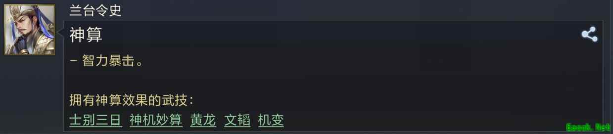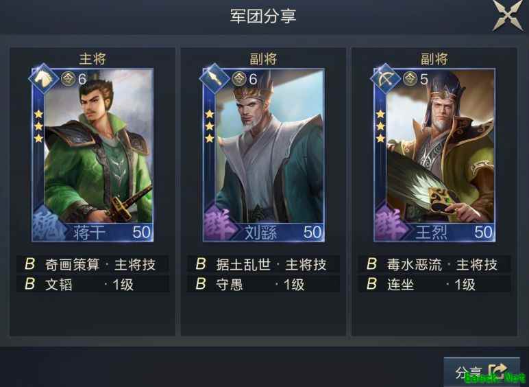 5、新手一开始在缺乏五星橙将的时候,可以将三星良将蒋干作为“智爆队”核心。蒋干的武技“文韬”可以提高自身的“神算”概率,搭配上三星良将虞翻可以兑换的武技“机变”,又能进一步提高“神算”概率,通过极高“神算”概率,打出不俗智伤输出。