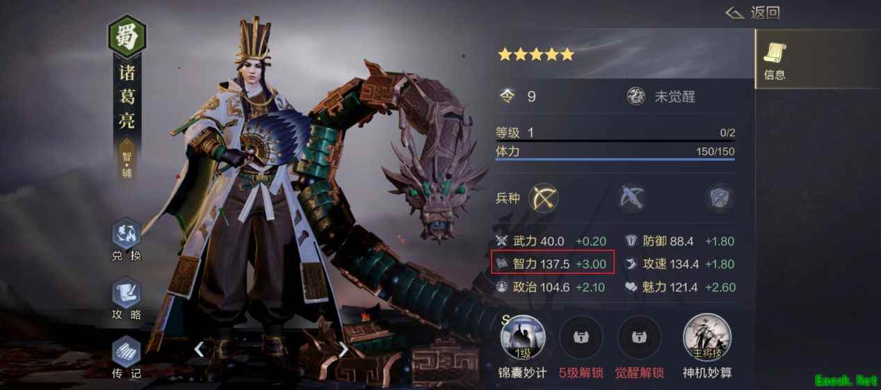 4、在组建“智商爆发流”队伍时,应尽可能地选择“智力”属性高的武将。如果一些武将,拥有提高主动技释放概率,又或增加“神算”概率的武技,那么一定做优先考虑,比如橙将诸葛亮。因为诸葛亮的主将技“神机妙算”可以增加自身“神算”概率,特色武技“锦囊妙计”还可以增加我方全体武将主动技释放概率。同时,“诸葛亮”拥有全武将中最高的基础智力,自身伤害不容小觑。