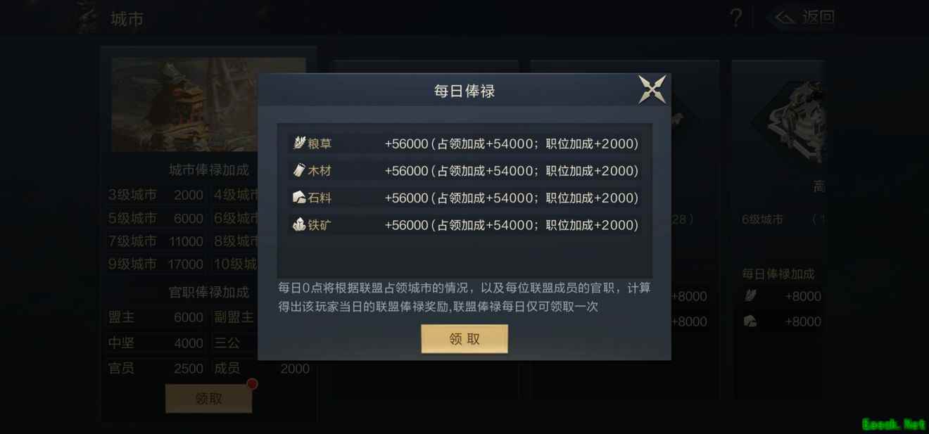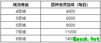 3、另外,不同等级的城池每天提供的资源也不一样,等级越高的城池每天产生的奖励也就越多。目前世界中的大城池最低4级,最高8级。