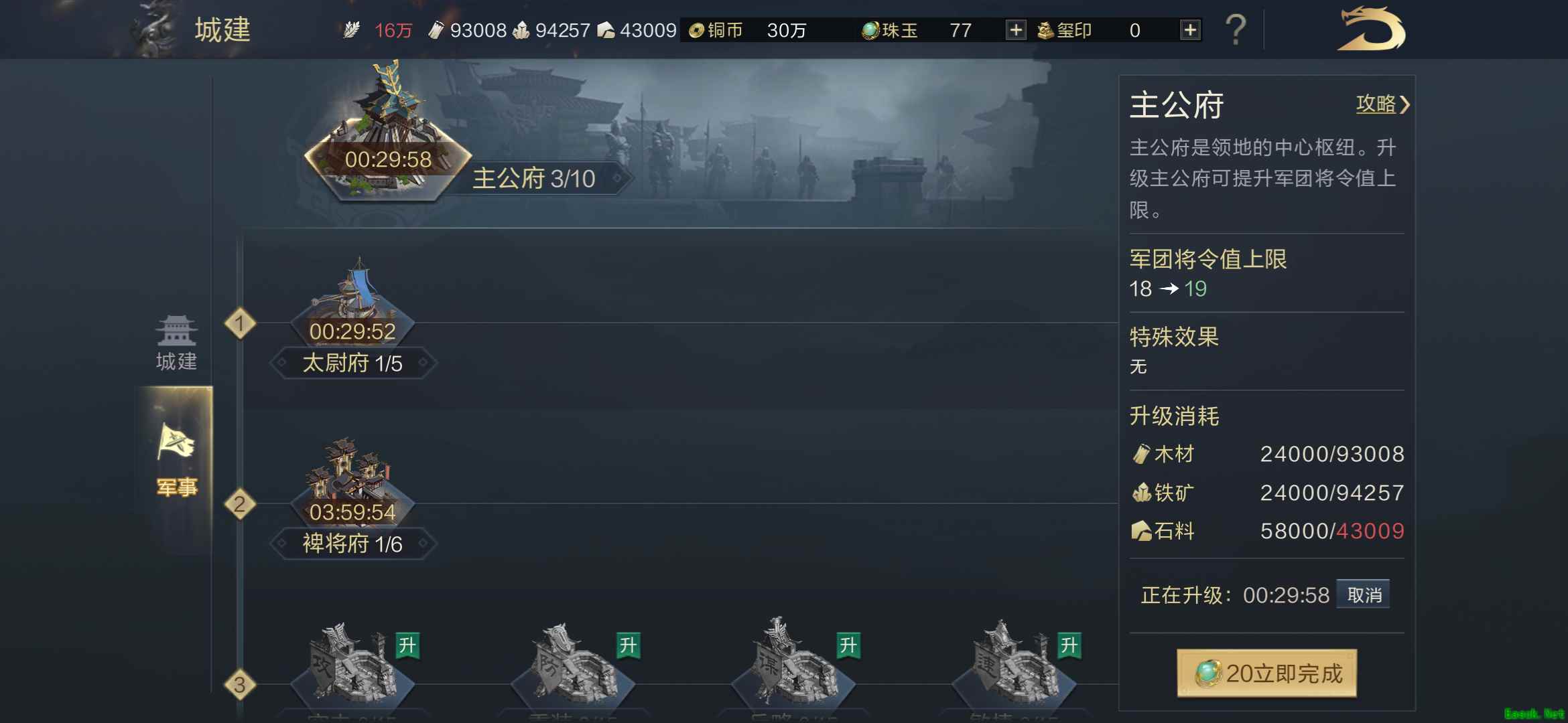前期的资源大多消耗在内政中,各种军事城建的升级都需要大量资源。建议优先升级太尉府和裨将府,提升军团数量和战力,让战力和资源间互惠互利,快速提升实力的方法就是抓紧和平机遇进行领土扩张。