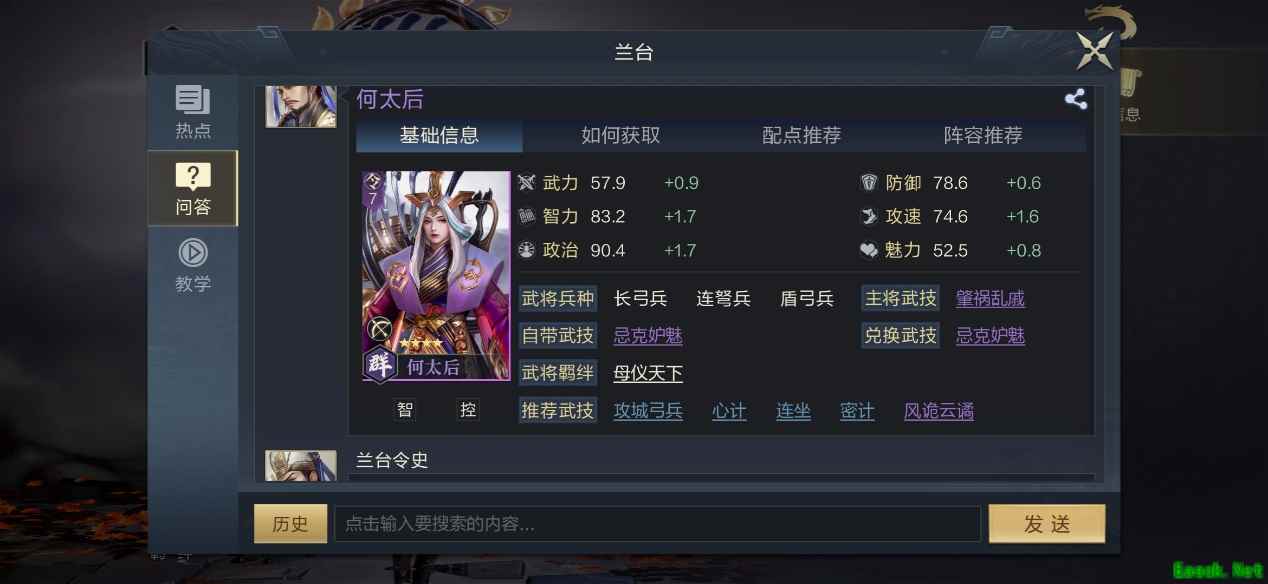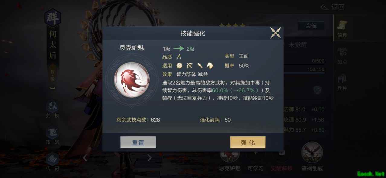 此外还有一个关键的点,那就是强势的魏国智力队就是以中毒为核心DEbuff的体系,比如郭嘉在面对中毒敌人可增加沉默技能概率,而贾诩则可以靠中毒打出更高伤害并重新续上中毒时间,有控有输出把中毒玩出了花,但魏智有控制却没有禁疗,这无疑是一个短板,这个时候何太后的定位就出现了,忌克妒魅作为毒系武技的一员,既可以帮助上毒还可以提供了禁疗效果,与魏智的毒系体系非常契合,进一步提升了其针对面。 不过相信看下来的小伙伴也可以发现,何太后强势就在于其技能,而前期作为开荒武将,何太后还是有点无力的,其拆解下来忌克妒魅是魏国智力队非常关键的素材,但前期也可以让其与其他法师队伍组成法系二队,中毒还有一个小优势,那就是输出稳定,在缺少输出的情况下,何太后可以作为二队的替补。