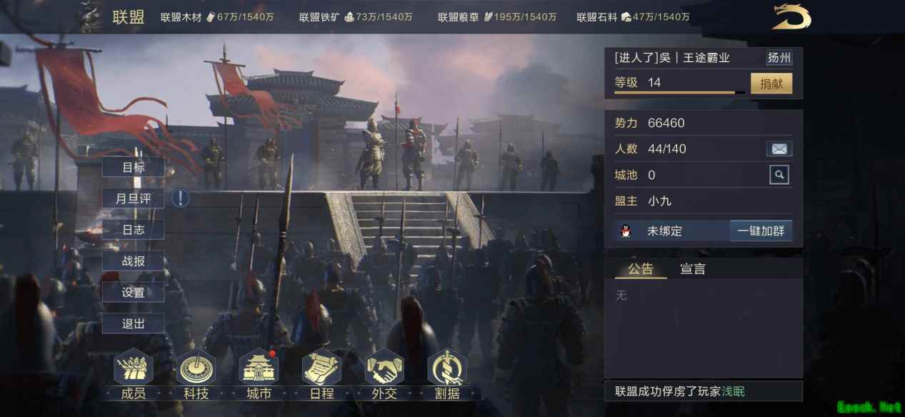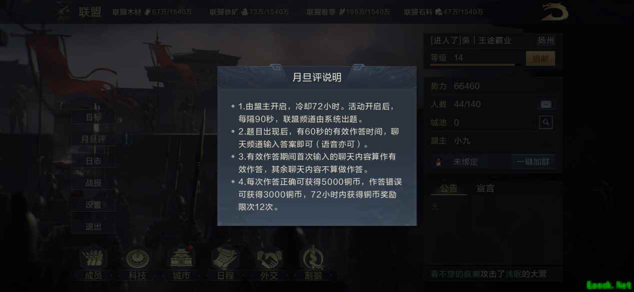 与大部分SLG游戏相比,整体上没有什么大方向的变化,但是细化更多功能与特色,比如个人的成就系统,还有作为社交核心的联盟玩法,这与最初的测试版相比改动非常大,但也非常让人满意。 联盟的功能非常多,拥有目标、月旦评、日志、战报、成员、科技、外交、割据等等功能,每一个分类都有自己独立的展示界面。 其中联盟目标各阶段分别代表着联盟占领的城市等级与数量,相当于玩家的名望系统,比起联盟等级更能证明联盟的含金量。日志全面记载联盟发生的事件,成员变动,战斗与外交。高等级联盟还可以开启月旦评活动给成员福利,12道系统问题,答错答对都有铜币奖励,比起奖励感觉更能活跃联盟气氛。作为SLG后期核心的外交盟战内容,现在鸿图的联盟功能已经非常齐全了,日程、外交、割据等相关的联盟功能,让联盟操作一目了然,后期盟战交锋,日程安排,结交友盟都逃不出这套框架。