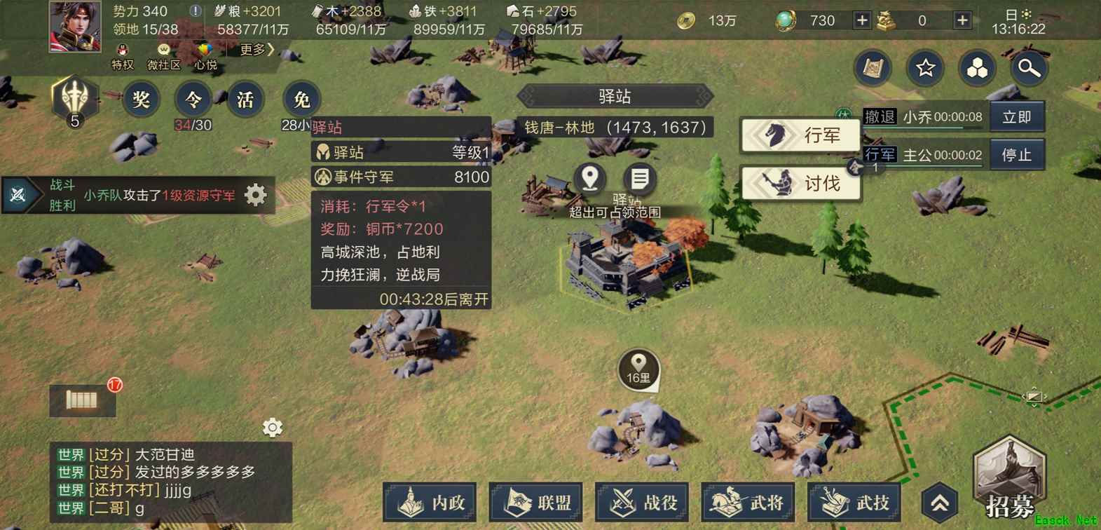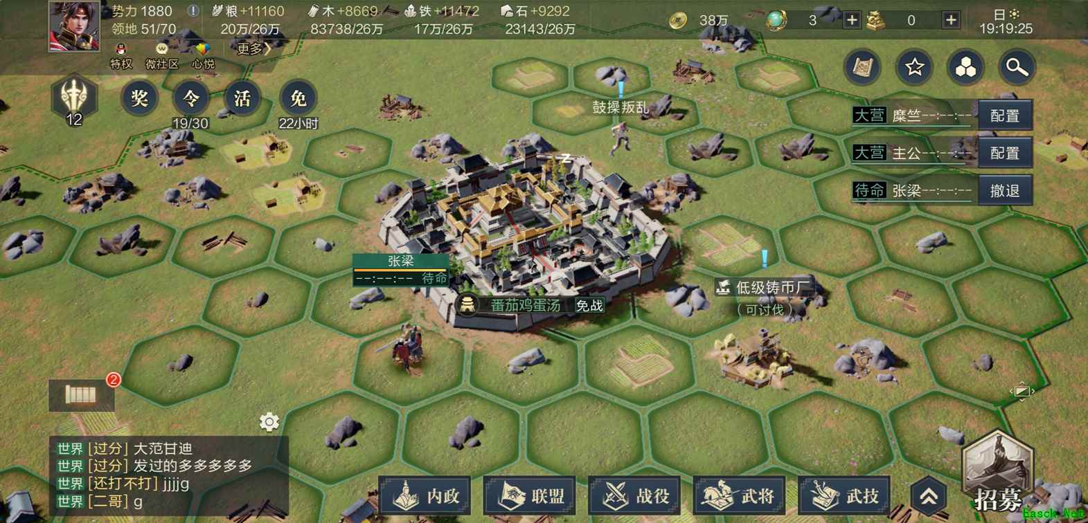 之前一直是点击大营之后选择入城然后配置自己手中的兵力的,后来我发现在大地图上右上角就有部队配置,只要部队是在城里,就可以直接点击配置对兵力进行填补,可以说是非常方便了。 对了,在占领一块土地之后你可以看到土地上面的小图标,有些是木头,有些是矿石,点击之后你就可以获取相对应的资源,蚊子再小也是肉,积少成多嘛,点击收获也是很快乐的。 前期的发展还是非常的轻松的,跟着游戏内的教程点点点就可以了,主城高挂免战牌,也不用担心有其他玩家骚扰,这段日子是非常舒服的。