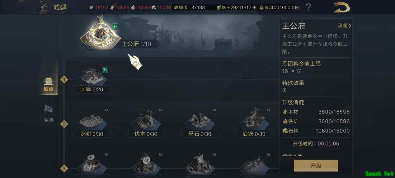 然后是发展内政,首先最重要的就是太尉府的等级,太尉府的等级决定了可以派遣几支队伍出征,出征的队伍越多,发展的也就越快。相关的还有提高将令上限的主公府和增加副将的裨将府,也需要提高等级,而在前期建立这些设施需要大量的石料,所以采石场可以优先多升几级来快速的度过前期。 说到资源,前期不仅石料奇缺,征兵还会消耗其他三种资源,还好新手期阵亡士兵的资源会100%返还,并且武将卸甲也会返还100%预备役士兵,适合我们在新手期快速练级发育。