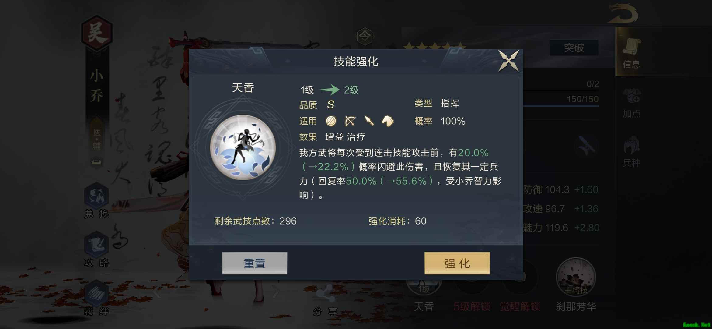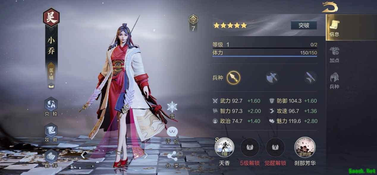 但小乔在前期的乏力并不只是其均衡的属性,其武技也是非常关键的。天香并非不强,就效果而言,面对菜刀队的连击可以概率闪避甚至回复治疗,绝对是使用的防守技能,但是这个技能也有一个问题,那就是太后期了! 前期军团的战力需要是像关羽这样输出暴力或者直接开场治疗的配置,这样的阵容才能在前期开荒中可以高效提升实力,这一点是小乔给不了,甚至不如直接上一个四星紫将来的实用,比如使用颜良文丑等一系列强势输出将。