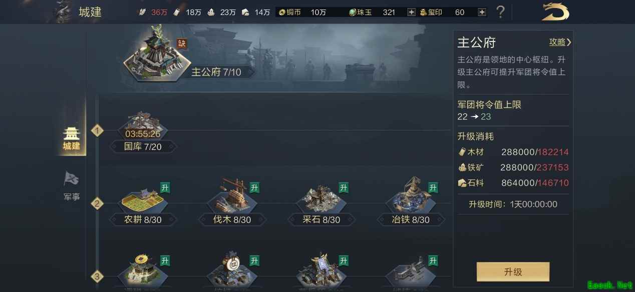 升本时,我们会发现主城最缺的资源是石料,可以说缺到令人发指,往往一次升本,一半以上的资源就是石料。 所以前期在占地时,一定要尽可能的优先占地石料资源地,同时开荒高级地也优先石料为目标。 在缺少资源之外,我们还会发现国库的上限往往是跟不上我们升本需求的,而将国库上限升级到升本要求,反而因为国库升级本身也需要消耗石料而拖累我们的进度。 所以我们需要一种特别的资源,那就是爆仓资源,即使超出国库的资源上限后也能获得的资源,同时这种爆仓也是大部分玩家公认的做法。 前期我们并不需要刻意的爆仓,只要根据声望任务也被称为主线任务,按部就班的升级建筑完成任务资源即可。