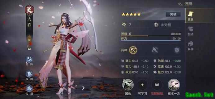 当然大乔也并非无敌的存在,她的定位是辅助与控场,必要时可以担任主将,就输出能力而言还是比较薄弱的,阵容需要补强输出武将,并给大乔在控制的同时赋予治疗系的武技,最好有给全队赋予的增益状态,让大乔自身的国色可以更好的发动,输出武将的选择比较自由,最好能带有控制的输出,孙策、孙尚香都是不错的选择。 不过前期对控制的需求并不强烈,输出反而更加重要,建议把大乔放入二队练级,或者早早给大乔学习一个核心治疗武技,让其治疗兼顾控制也可以上一队,不是做主将。或者在后期的时候,7级主城,通过练兵所直接消耗资源获取经验。