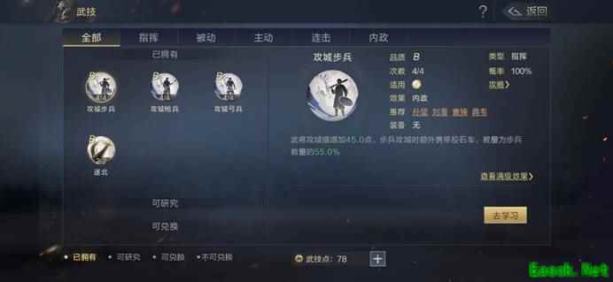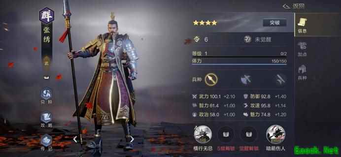 张绣作为紫将,定位必然是过渡,但之所以能成为过渡的主力选择之一,在于他的技能,张绣的武技“横行无忌”是少有的既是单体又是AOE的技能,而初始属性也是四星中相当不错的水平,武力属性破百, 攻速与防御也不拉胯,是一个纯输出的武将。 张绣“横行无忌”是非常适合开荒的,结合其他武将或者搭配的情况,爆发力非常不错,即使中期也有不错的发挥,武技选择推荐武力单体,类似擒龙缚虎等爆发武力就非常适合,不过对技能没必要过于投入,建议在5级以下即可,后期无疑主力阵容还是要橙将为主的,用来升级武技的武技点非常珍贵。