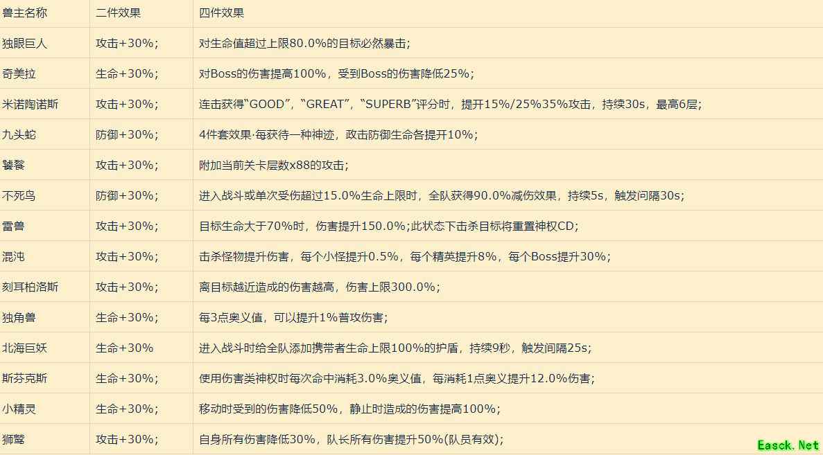 奇美拉: BOSS套:遇事不决,新手过度万能套装;表现稳定,主线短关通关首选 触发条件: 对Boss造成伤害,受到Boss伤害 触发效果: 对Boss的伤害提高100%,受到Boss的伤害降低25% 角色收益: 打短副本即兽主本,三间都是BOSS,收益堪称最稳定的100%伤害加算,以及25%免伤乘算,以及30%生命加算