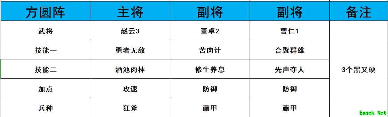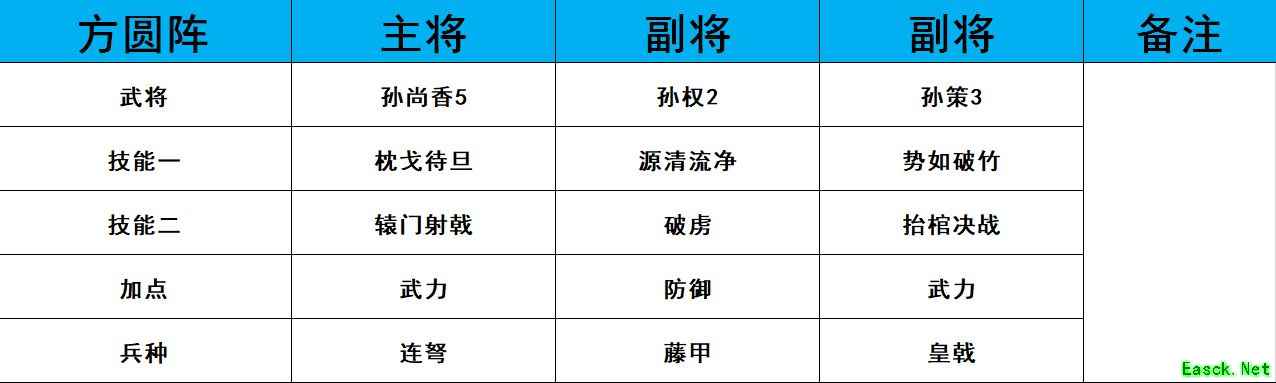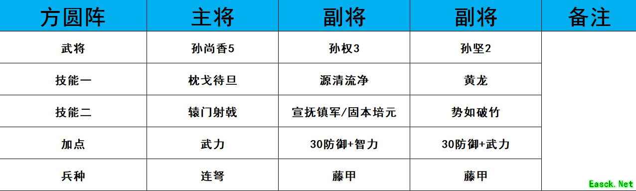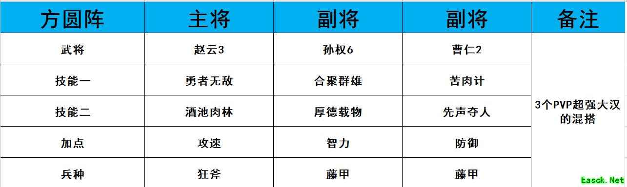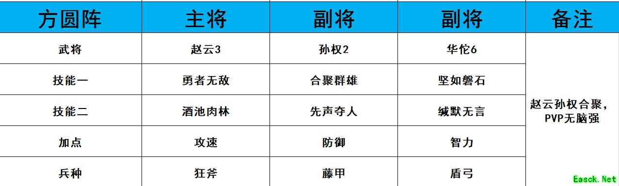 这个阵容用来开荒打地战损非常的厉害,前期的PVP能力比较中等,但是满级满科技之后是非常的厉害的,尤其是刘备,他的25%的加成是非常的可怕的。 二、孙权赵云合聚