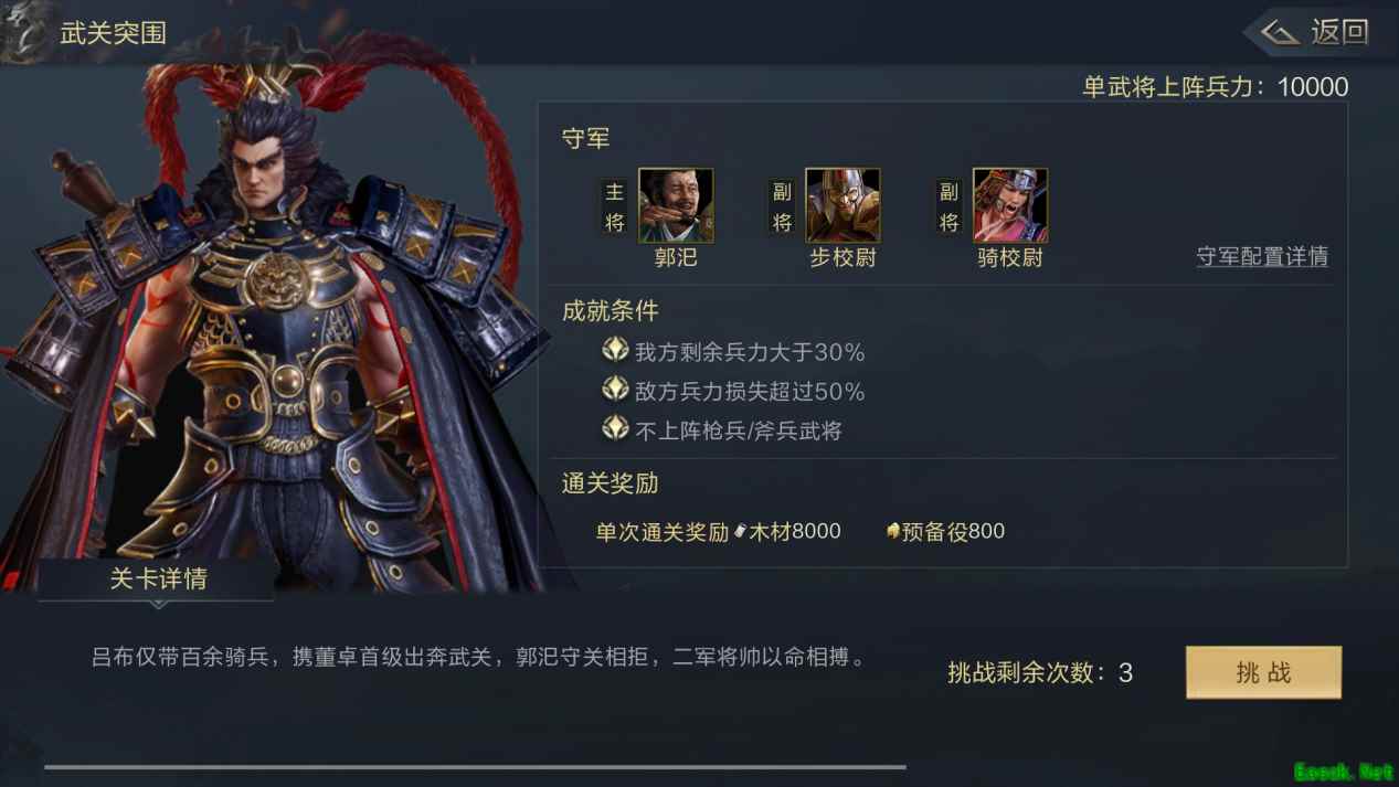 成就星级条件: 1、我方剩余兵力大于30% 2、敌方兵力损失超过50% 3、不上阵枪兵/斧兵武将 敌方阵容:主将 郭汜(弓兵4000兵力),步校尉(步兵4000兵力),骑校尉(骑兵4000兵力) 通关奖励:石料8000 预备役800 【己方阵容】