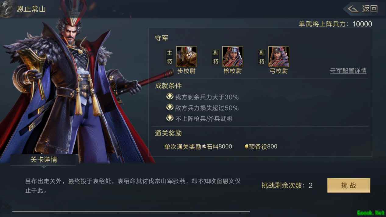 成就星级条件: 1、我方剩余兵力大于30% 2、敌方兵力损失超过50% 3、不上阵枪兵/斧兵武将 敌方阵容:主将 步校尉(步兵4000兵力),枪校尉(步兵4000兵力),弓校尉(弓兵4000兵力) 通关奖励:石料8000 预备役800 【己方阵容】