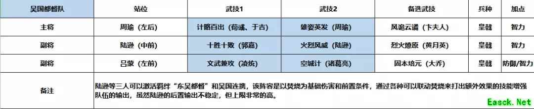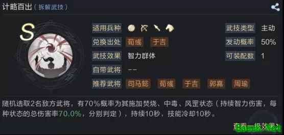 选择吕蒙而不是鲁肃主要是因为吕蒙的武技强化效果更稳定,鲁肃的神算始终会成为团队的不稳定因素,加之陆逊的输出也不稳定,如此一来,鲁肃能发挥的效果可能会很低。并且队伍中缺少一个前排,吕蒙的属性则更适合作为队伍前排。 【技能搭配】 周瑜: 技能一【计略百出】 该技能可以分别判定三种debuff状态。一方面保证队伍的基本输出,另一方面增加了焚烧和风罡效果的存在时间,让陆逊的【火烧连营】每次发动时都可获得概率增强,也保证了自己武技发动时获得的大量额外伤害。