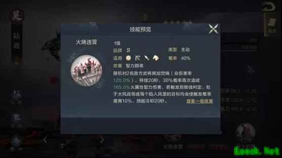 技能二【雄姿英发】 增加自身的输出能力。其施加的效果可让敌人受到的智力伤害增加,提高自身和队伍整体的伤害下限。 陆逊: 技能一【十胜十败】 同一个状态效果并不会叠加伤害,所以队伍的伤害更多是依靠后置技能的释放来联动焚烧制造,防止武将被沉默就尤为关键。吕蒙的武技会让被强化的己方武将陷入缴械状态,【十胜十败】可以去除这个负面影响~