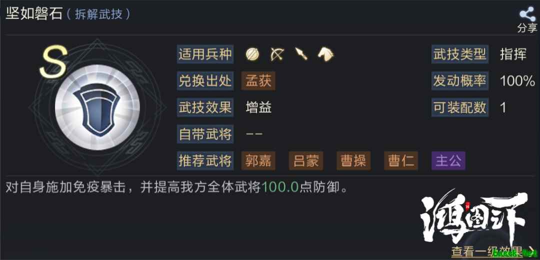 1号技能推荐坚如磐石,该技能可为全体友军提高防御力,并且自身将免疫暴击,对于辕门射戟这样专打后排的爆发技能非常有效,可大幅降低华佗的暴死率,并且整体提升防御能力。