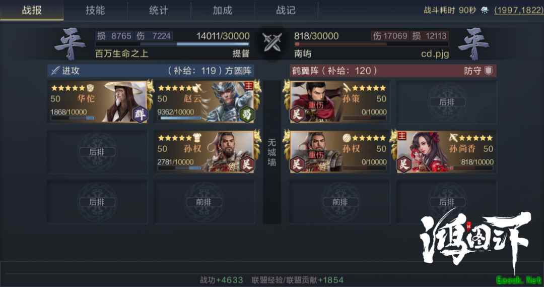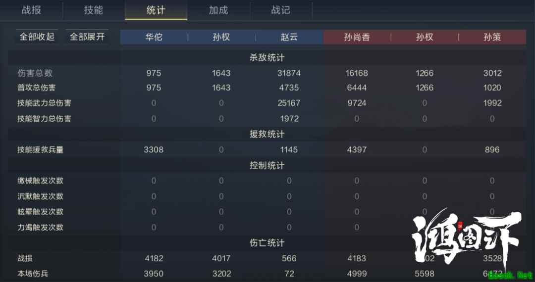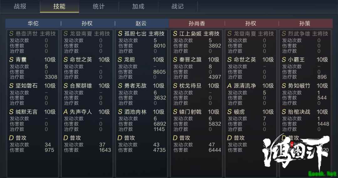 2号技能推荐先声夺人,该技能是专为赵云准备的,先声夺人可让己方枪兵武将在触发连击伤害之前,偷取目标50点武力和防御,持续10秒,并可叠加两层,是提升赵云连击伤害和普攻伤害的关键技能。 四、【实战效果】 实战中,武将的站位需要根据实际情况进行调整。如对方主将在后排,且前排属于纯肉型武将,那么可以将赵云安排在侧列,让孙权去抗伤;如果敌方主将在前排,那么直接将赵云与敌方主将安排到同列即可。这里以三孙队进行强度测试,战报如下: