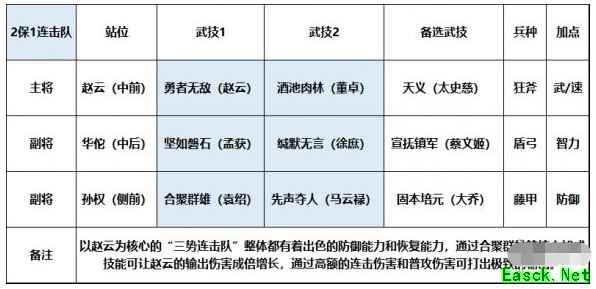 三是伤害增量,连击技能的触发几率较低,一般增伤类无法稳定的让连击触发处于属性加成时间内,而龙胆可在触发连击时稳定造成额外伤害。 赵云本身就是一个完全追求极致输出的角色,小图在这里为大家推荐一个2保1阵容,通过两名辅助的保护和加成,可让赵云一个人打出一整队的伤害。 二、【阵容搭配】