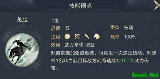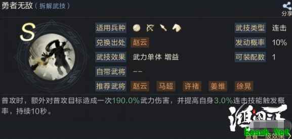 1号武技推荐勇者无敌,触发后可造成不错的武力伤害,并提升3%连击触发概率。不要小看这3%的触发概率,作为队伍中唯一且用连击为核心输出方式的赵云来说,这3%的概率带来的回报期望非常高。