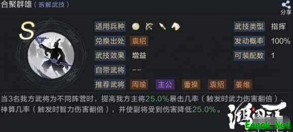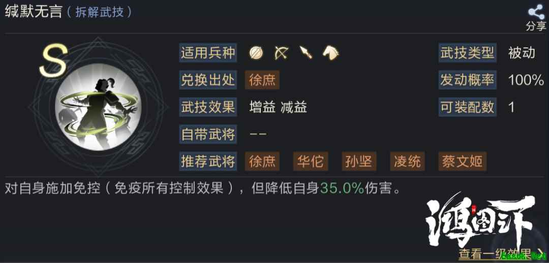 2号技能推荐缄默无言,可让华佗免疫所有控制效果,但伤害降低35%。作为依靠自带武技主动效果来为队伍提供治疗的华佗来说,免控是非常重要的,而伤害降低35%的debuff对华佗影响也不大,其本身就不需要打输出。 3、孙权 工具人角色,之所以选择孙权做为三势之一,是因为孙权的自带武技可对状态效果进行增幅或减幅,并且效果稳定施加给友方角色,也就是赵云和华佗。 1号武技推荐合聚群雄,这是队伍成立的核心技能,该技能可让主将赵云获得25%的暴击几率,并为副将提供25%的减伤效果,是提升输出和坦度的关键技能。