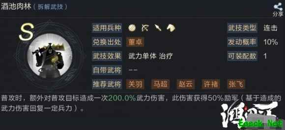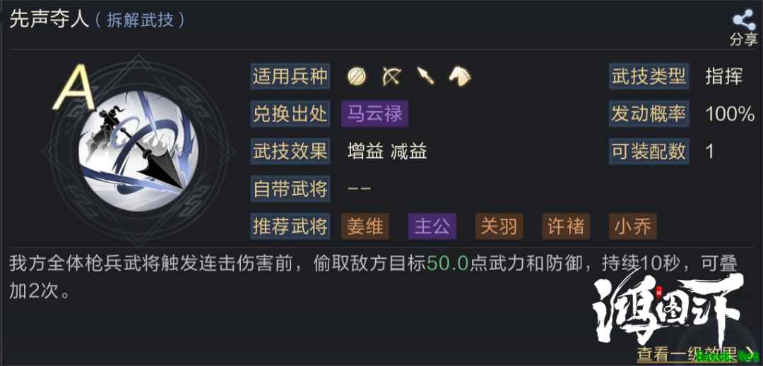 这套阵容门槛并不高,除了必要的合聚群雄和先声夺人以外,赵云的武技只要是连击武技基本都可以用,而华佗的配置也可以更换为其他治疗保护技能。 推荐的阵容配置只是较稳定保守的一种,如果追求全面输出的主公可以将华佗和孙权更换为张辽等连击核心将。 三、【技能配置】 1、赵云 队伍核心输出,武技必选连击类,以附带增益效果的连击技能为主要选择方向。